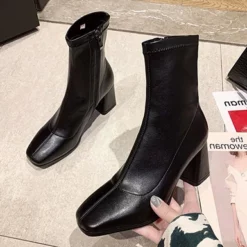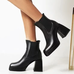 WMNS Elastic Insert Slip On Boots – Square Toes / Platform Chunky High Heel