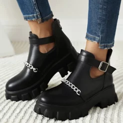 WMNS Rivet Strap Accent Zipper Platform Boots – High Chunky Heel