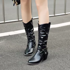 WMNS Side Zipper Grain Leather Boots – Chunky Mid High Heel