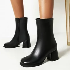 WMNS Square Toe Calf Length Boots – Wide Chunky High Heel
