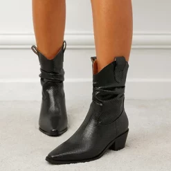WMNS Snake Skin Pointed Toe Pull On Slouch Style Mid High Heel Boots
