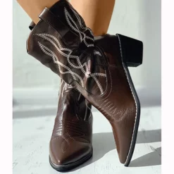 WMNS Western Style Embroidered Soft Leather Long Toe Mid-High Heel Boots