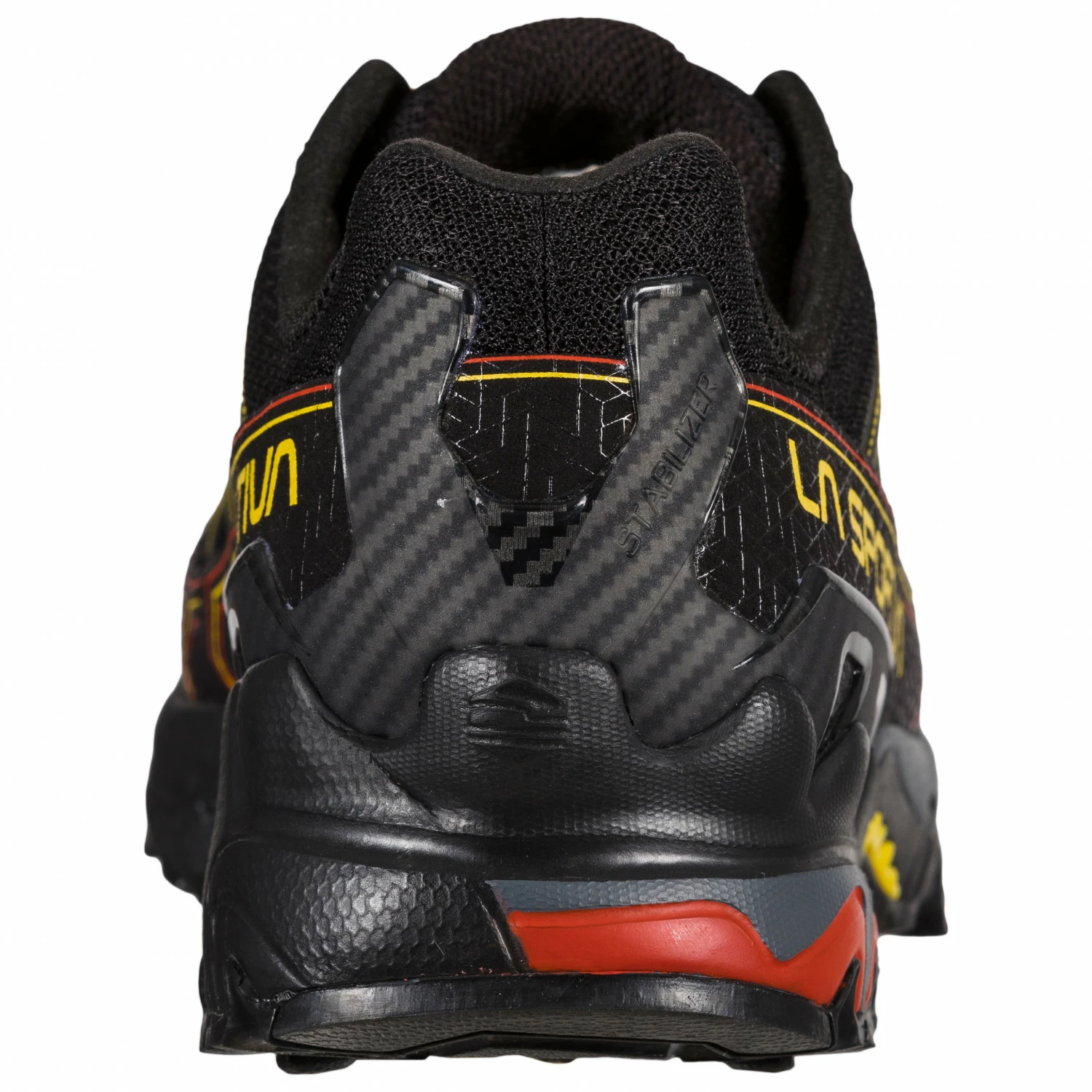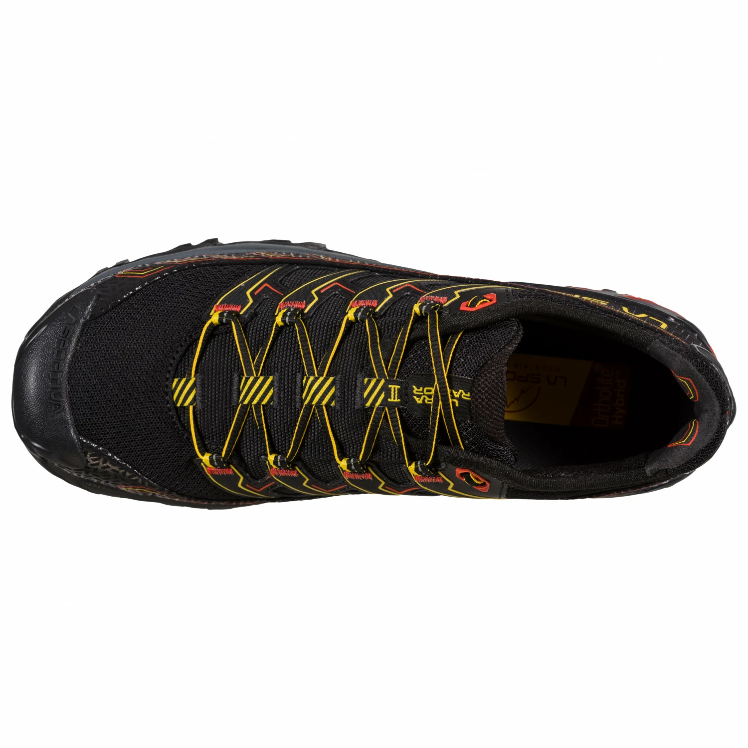 The Ultra Raptor II Wide trail running shoes from La Sportiva are perfect for training and competitions! Thanks to their breathable upper, these shoes quickly wick away moisture to the outside. Reinforcements safeguard the shoes from abrasion and protect them from mud. With the high traction FriXion outsole, you’re offered an excellent grip, even when travelling down steep hills. Plus, the multi-directional lugs offer you improved safety while running. An active running feel with a dynamic foot strike is optimised by the midsole and the Ortholite insole. In addition, the shock-absorbing toe caps keep you well protected in rough terrain. Ideal for demanding trails!