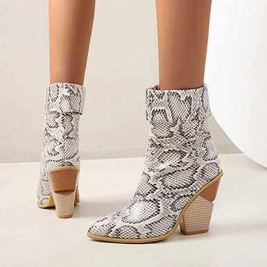 Maintaining a stylish look is a lot easier when you have great looking boots like these to wear. The rolled cuff top of the boots gives you the look of old style boots that have been folded down to make them not as high. Reinforced with stitching, these boots will maintain your look for years to come. The slip-on style of the boots makes it easy for you to have the fashion you desire without having to mess with laces or buckles. Pointed toe box is perfect to maintain that fashionable look and to keep you feeling comfortable with plenty of room for your toes to move within. High heel is a chunky style that is in the fashion you would normally find in a wedge to offer you the height you’re looking for while maintaining your ability to remain surefooted. Reptile finish to the material is another fashionable way you’re going to put your best foot forward.