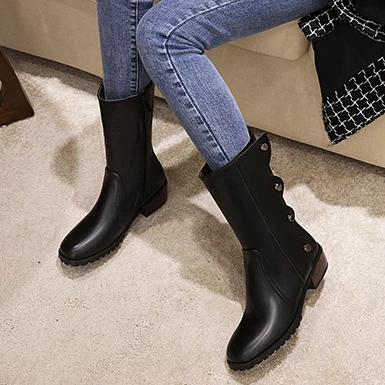 WMNS Grain Leather Finish Studded Shin Boots – Mid High Heel
