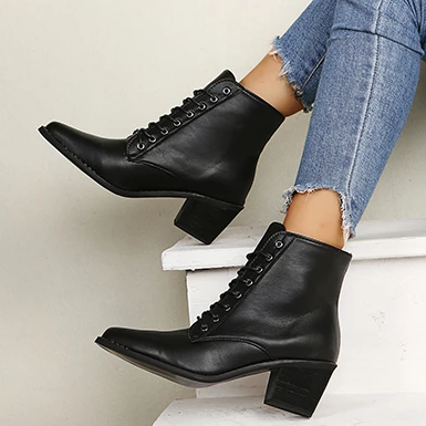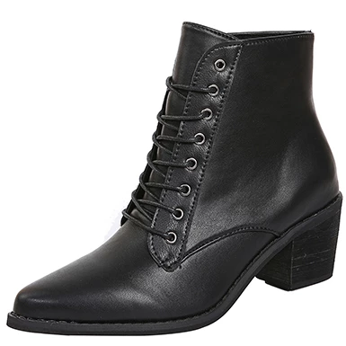 WMNS Lace Front Pointed Toe Stacked Mid-High Heel Leather Boots