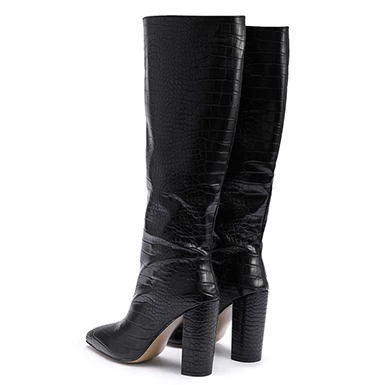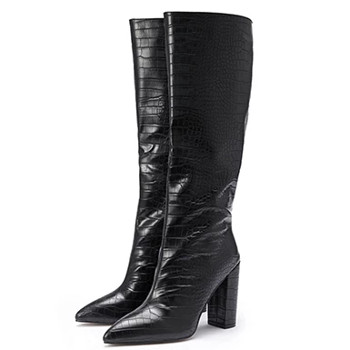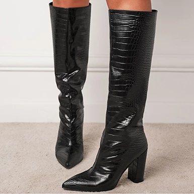 Your individual style will be on display when you have boots like these you can slip your feet into. Coming up to your knees, these boots offer you a look that is going to be impossible to ignore. Reptile leather throughout is a stylish choice that will make sure everyone knows you are a force to be reckoned with. Pointed toe box means that you are going to be adding style and sophistication to every outfit you wear the boots along with. Contoured flat soles are perfect to maintain your comfort while also making these boots perfect for wearing while you are in urban settings. High and wide chunky heels provide you with additional height while you are still able to get the kind of stability that will make getting out and having some fun even easier for you to do. Single color styel of the boots makes mixing and matching even easier.
