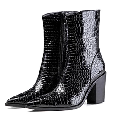 WMNS Reptile Leather Calf Length Boots – Pointed Toes / High Chunky Heel