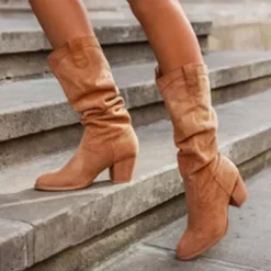 WMNS Rivet Accented Pedestal High Heel Boots – Almond Toes