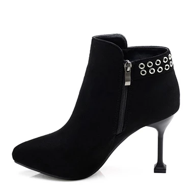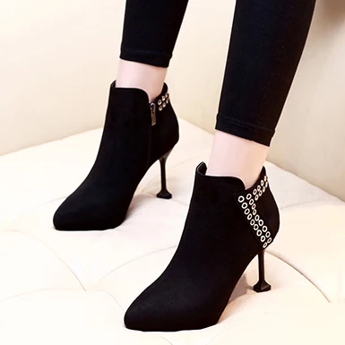 You are going to love the look that you create for the cold months when you have boots like these. Made from suede, these soft looking shoes are the perfect complement to your looks that beat back the chill. Almond shaped toe box offers you a stylish look that is still comfortable for your toes. Contour shape of the sole helps to make sure your feet are even more comfortable as it moves up to the high heel. Pedestal style in the high heel is squared with a wide base for additional stability and style. Rivets accent the outside of the boot with an angle that wraps back around the ankle in a double row. Full zipper on the inside means you will have an easy time getting the boots on and off. The single color design of the boots means you will have an easy time mixing and matching your look.