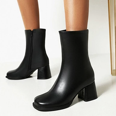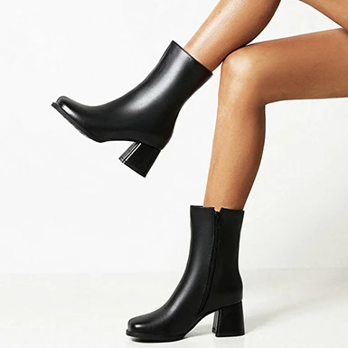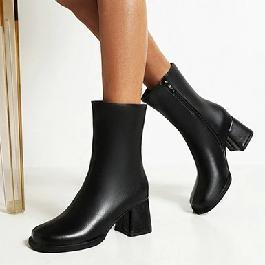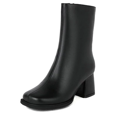 WMNS Side Zipper Grain Leather Boots – Chunky Mid High Heel
